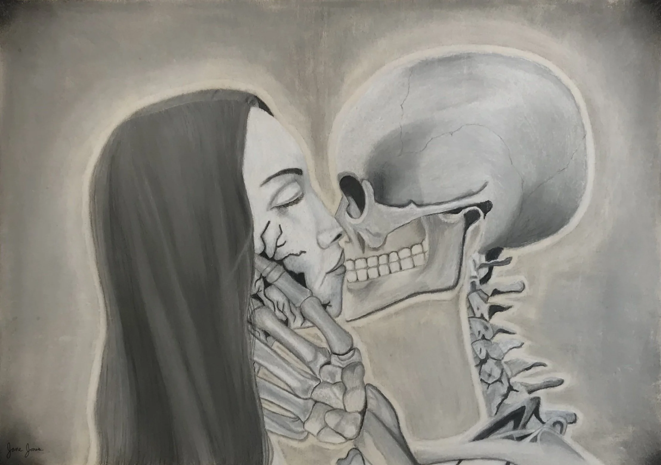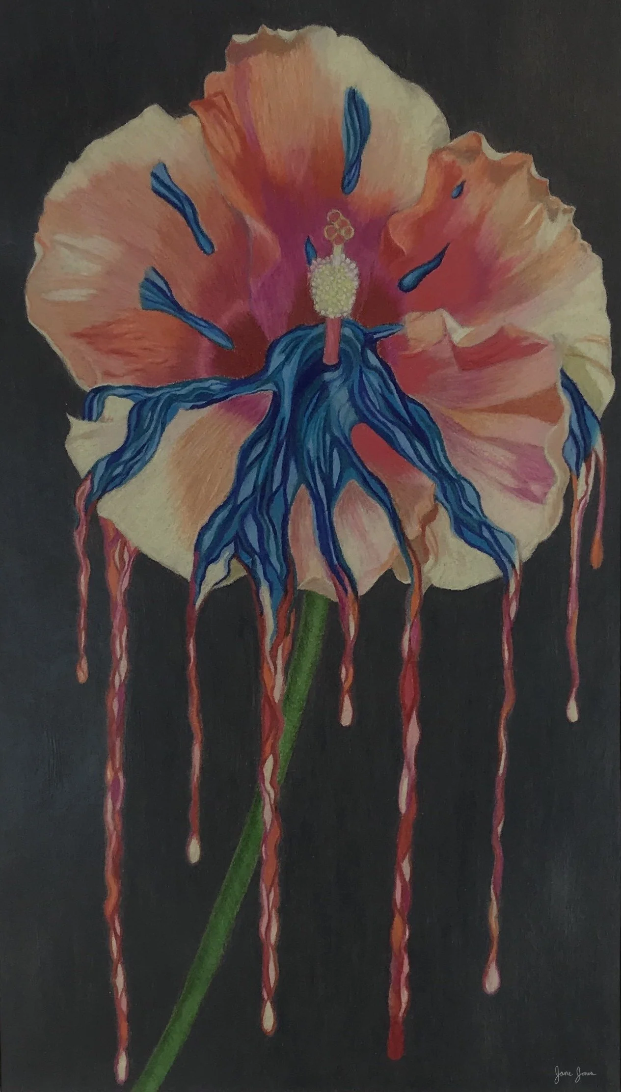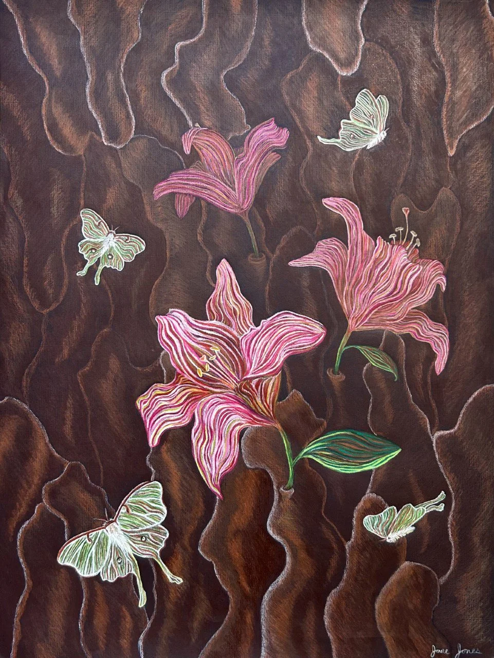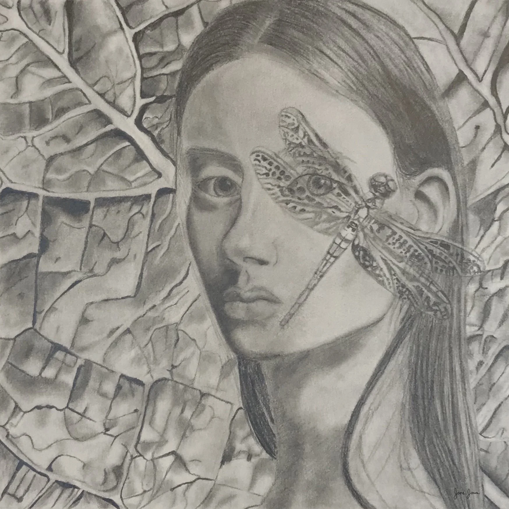 These pieces were created primarily in my adolescence. They explore the wonders of the natural world and the ways imagination can capture things that cannot occur in real life. Octopuses cannot roam the galaxy and flowers cannot melt into multicolor streams. The pieces towards the bottom of the page allowed me to capture the darker aspects of human nature. They explore how people can hide parts of themselves or seek to corrupt others. The moody, deep contrasts of the charcoal helped me achieve the seriousness and horror that this topic required. The only piece made during my adulthood on this page is “Lunas & Lilies.” This piece greatly influenced my creative direction. It made me want to create pieces that focused on bringing the beauty of the natural world into the home. This expanded on themes I previously explored and led me to make the seamless patterns found on the “Surface Designs” page.